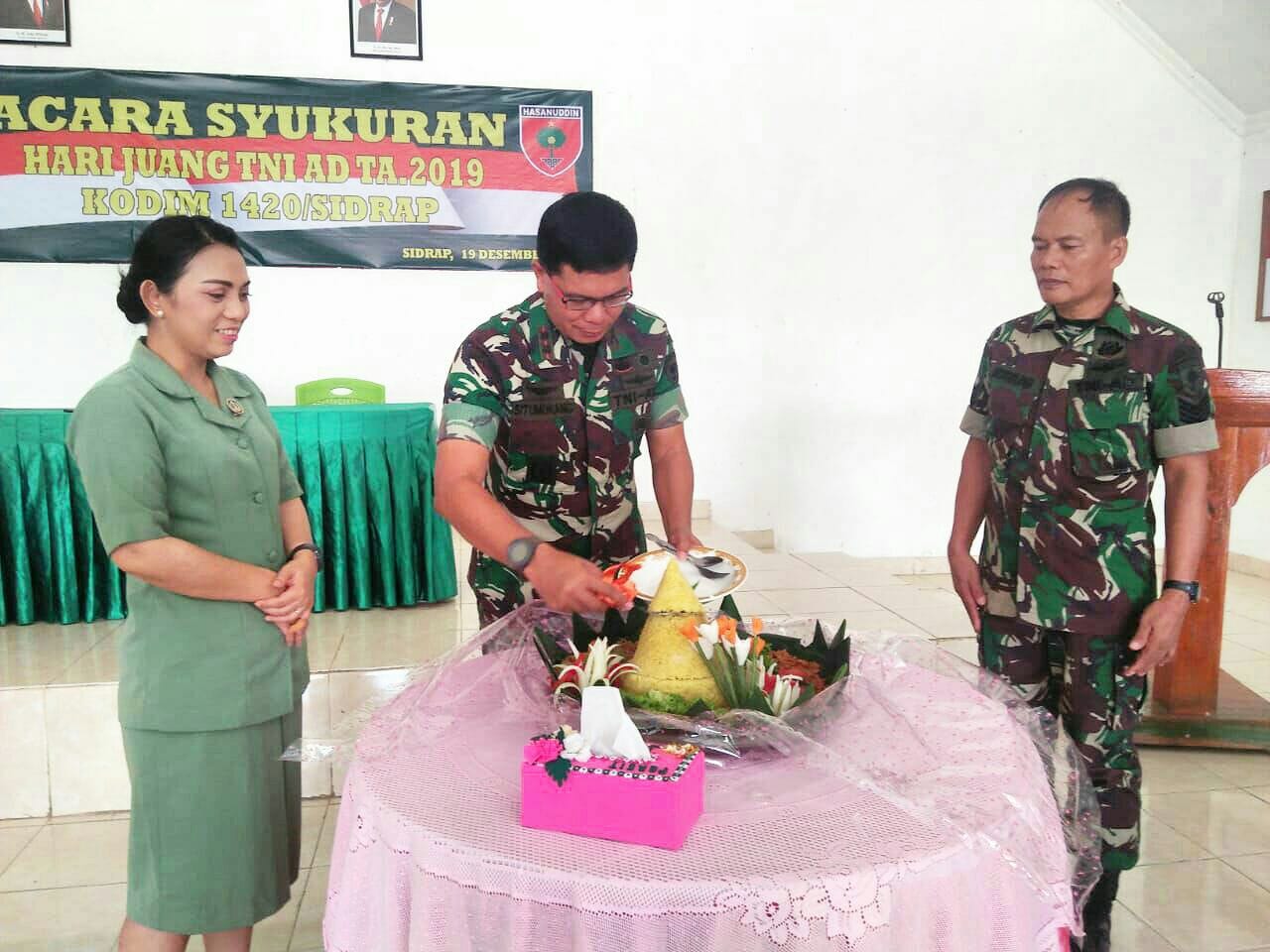 Sidrap, MitraSulawesi.id–Usai mengikuti Upacara, Komando Distrik Militer (Kodim) 1420 Sidrap menggelar acara syukuran dalam rangka Hari Juang Tentara Nasional Indonesia Angkatan Darat di Aula Makodim 1420 Sidrap Kelurahan Majjelling Wattang Kecamatan Maritengngae Kabupaten Sidrap, Kamis (19/12/2019).