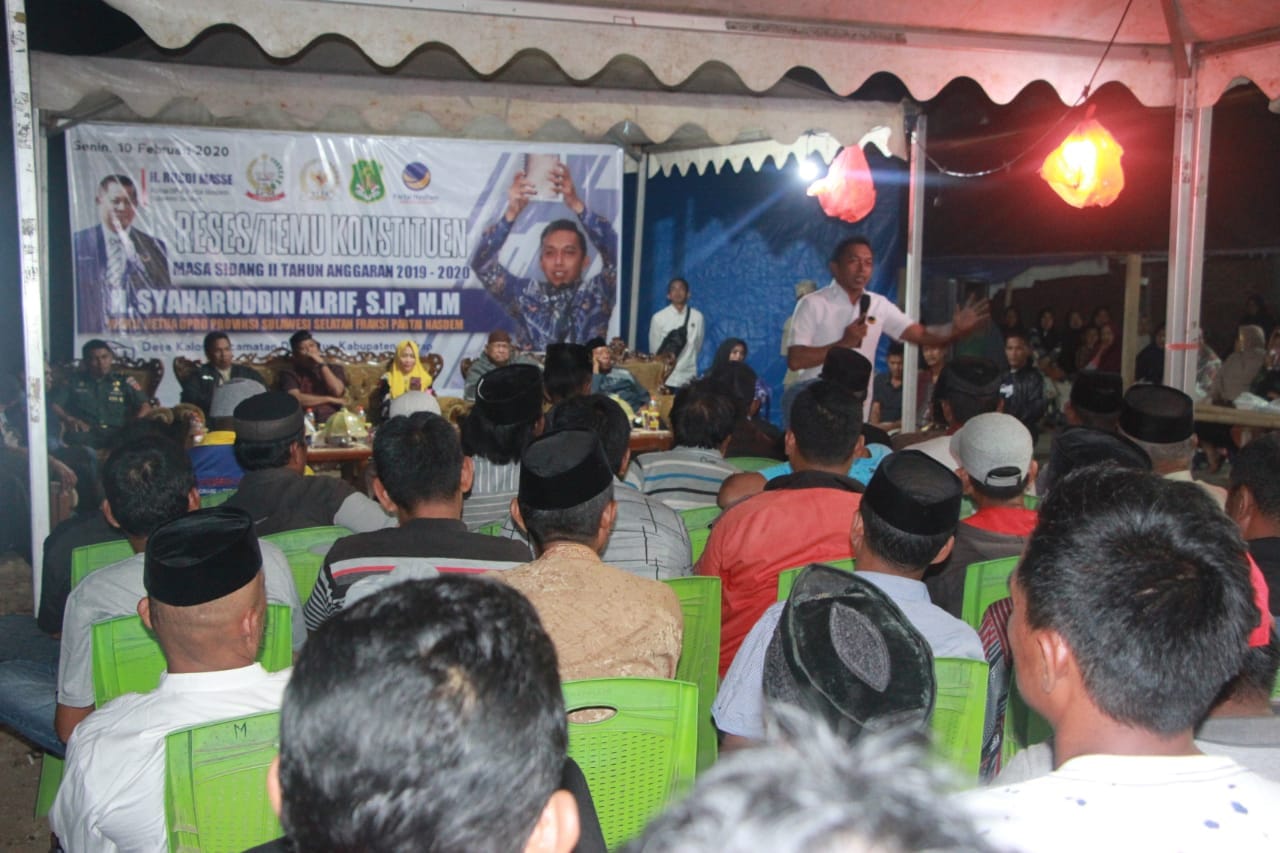 SIDRAP, MitraSulawesi.id — Wakil Ketua DPRD Sulsel, H Syaharuddin Alrif kembali menggelar reses Temu Konstituen, di Rumah kediaman salah satu anggota DPRD Kabupaten Sidrap, fraksi Partai Nasdem, Hj Kartini, di Kecamatan Duapitue, Sidrap, Senin malam 10/02/20.