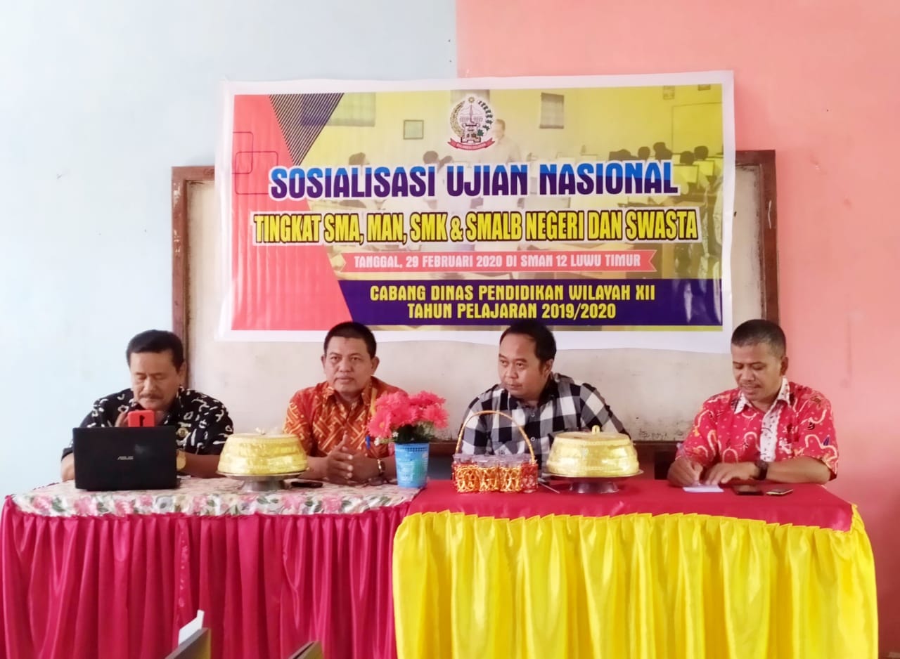 LUTIM, mitrasulawesi.id – Usai wilayah Kabupaten Luwu Utara, Cabang Dinas Pendidikan Provinsi Sulawesi Selatan wilayah XII kembali gelar sosialisasi ujian nasional tingkat SMK, SMA Negeri dan Swasta di aula SMK Negeri 12 Luwu Timur Kecamatan Malili, Jalan Pendidikan puncak indah, Sabtu (29/2/20).