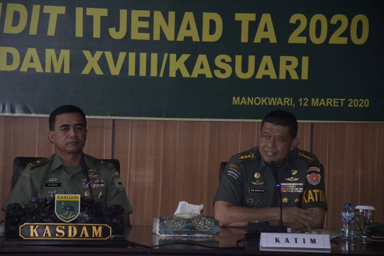 Pangdam XVIII/Kasuari Mayjen TNI Joppye Onesimus Wayangkau menyampaikan hal itu dalam amanat tertulisnya yang dibacakan Kasdam Brigjen TNI Ferry Zein dihadapan Tim dari Inspektorat Jenderal Angkatan Darat (Itjenad) Markas Besar TNI Angkatan Darat (Mabesad), para Asisten, Kepala dan Komandan Satuan pada acara Taklimat Awal Pengawasan dan Pemeriksaan (Wasrik) Post Audit Itjenad TA. 2020 di Kodam XVIII/Kasuari, Kamis (11/03/2020) di Ruang Yudha Kodam XVIII/Kasuari, Arfai I, Manokwari, Papua Barat.