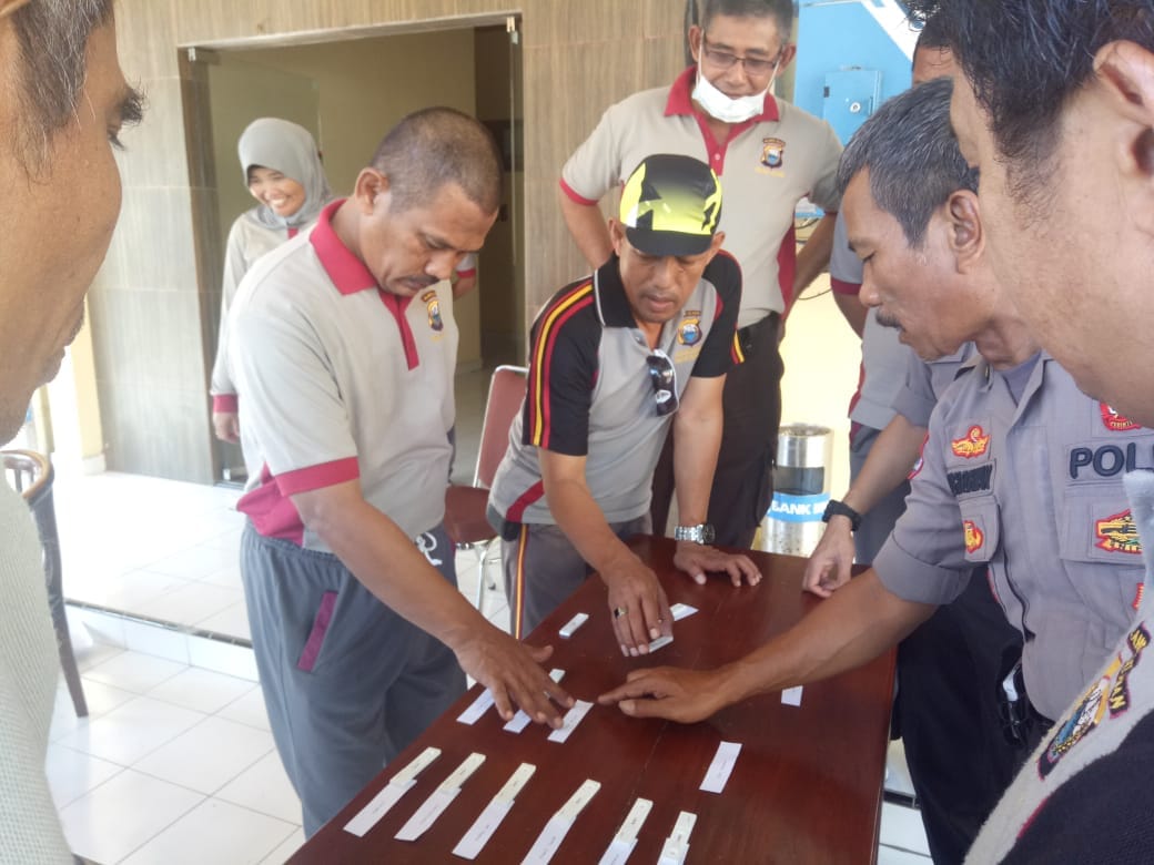 Takalar, MitraSulawesi.id–Kapolres Takalar AKBP Budi Wahyono, S.H., S.I.K., M.H., bersama Wakapolres Kompol H. Andi Tonra Lipu, S.H., M.H. dan seluruh Kabag, Kasat serta Kasi Polres Takalar melaksanakan tes urine di Lobi Mapolres Takalar, Jumat 20/03/20.