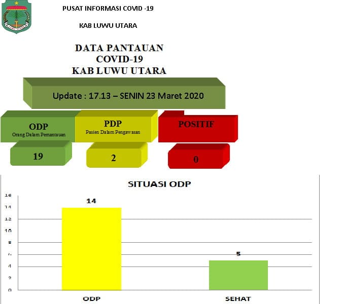 LUTRA, mitrasulawesi.id – Gugus Tugas Percepatan Pencegahan Covid-19 Pemerintah Daerah (Pemda) Kabupaten Luwu Utara kembali merilis data terkini terkait jumlah orang dalam pemantauan (ODP) dan pasien dalam pengawasan (PDP), Senin (23/3/2020).