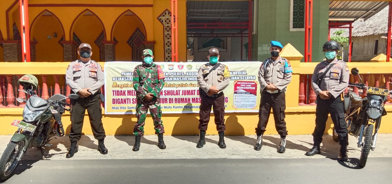 Selayar, mitrasulawesi.id – Personil Polres Kepulauan Selayar dan TNI menindak lanjuti kebijakan pemerintah untuk tidak melaksanakan Sholat Jumat dan melaksanakan Sholat duhur dirumah sebagaimana surat edaran Bupati Kepulauan Selayar tertanggal 30 Maret 2020 nomor : 440/58/III/2020/kesra guna mencegah penyebaran Pandemi Virus Corona di Kab Kep Selayar. (10/4/20).