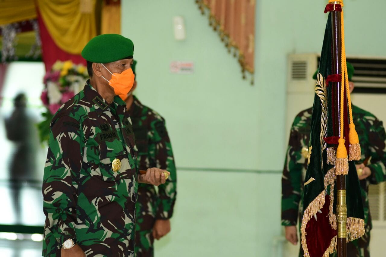 Makassar.Sulsel.Mitrasulawesi.id –-. Dengan mengacu kepada protokol Kesehatan yang berlaku ditengah covid – 19, yakni pengaturan jarak fisik (Physical Distancing) dan penggunaan masker. Serah terima jabatan Danrem 142/Tatag dari Kolonel Inf. Eventius Teddy Danarto kepada Kolonel Czi. Firman Dahlan, S.IP tetap berlangsung hikmat. Jum’at (24/04)