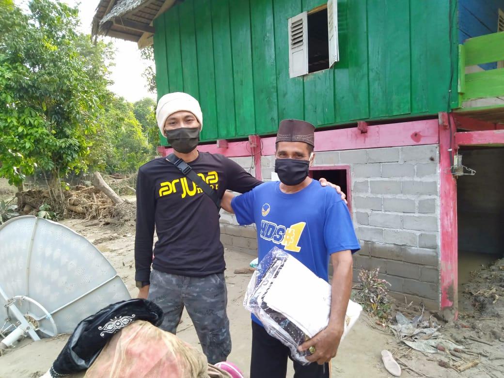 Menurut Ajie Saputra, warga yang kita bantu ini, hampir separuh dari rumahnya terseret arus banjir bandang semalam.