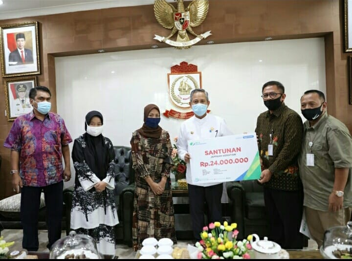 Selain menyerahkan bantuan sembako, juga diserahkan santunan bagi pengguna BPJAMSOSTEK, berupa santunan kematian, santunan kecelakaan kerja, jaminan hari tua, serta jaminan pensiun.