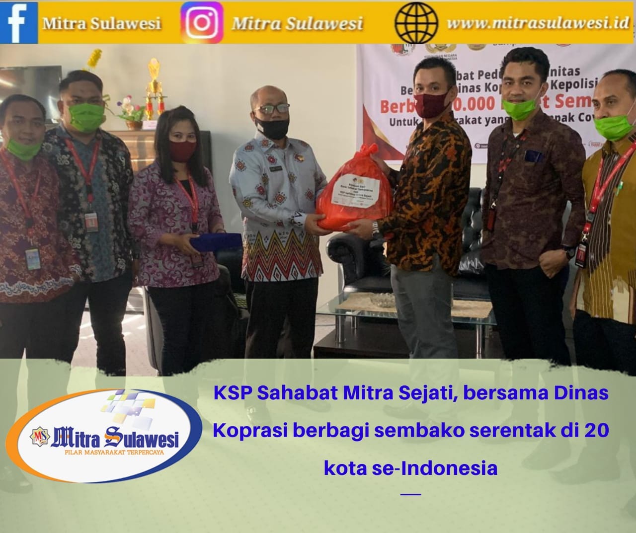 Luwu, Mitrasulawesi.id– Setelah sukses melaksanakan kegiatan bagi-bagi paket sembako, yang serentak di 20 kota se-Indonesia, KSP Sahabat Mitra Sejati dan mitra bersinergi bersama Dinas Koperasi dan Kepolisian setempat, kembali melakukan aksi pembagian paket sembako di 20 kota/kabupaten di Indonesia. Kegiatan tahap pertama telah dilakukan pada tanggal 14-18 Mei 2020.