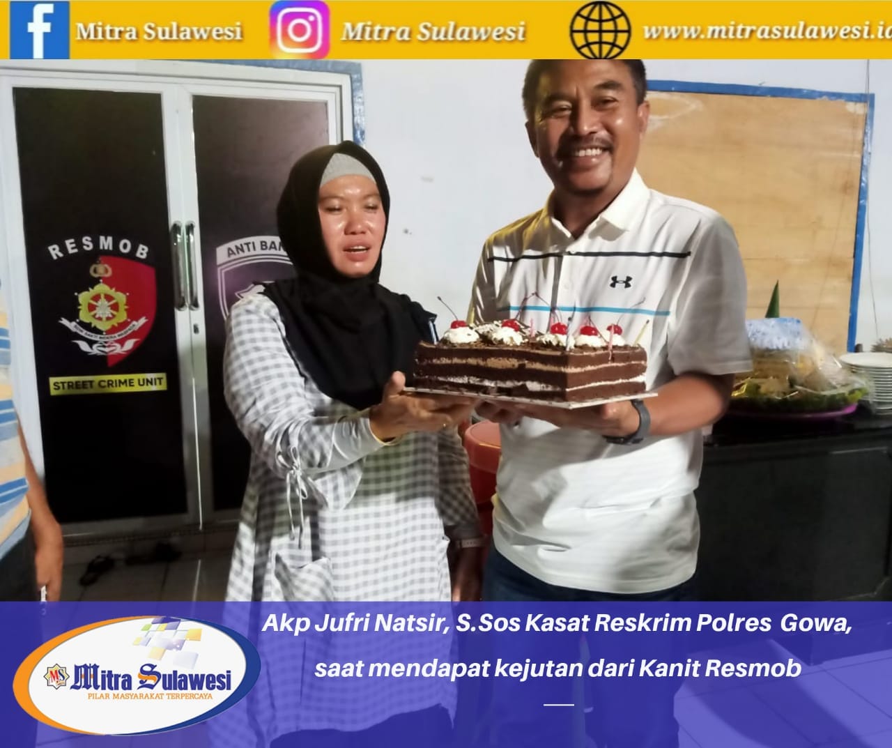 Gowa,Mitrasulawesi.id– Kasat Reskrim Polres Gowa Akp Jufri Natsir, S. Sos mendapatkan kejutan di hari ulang tahunnya yang ke-52. Kejutan ulang tahun kali ini diberikan oleh Kanit Resmob Anti Bandit Ipda Andi Imran Hamid,S.Sos, MM dan anggota res lainnya.