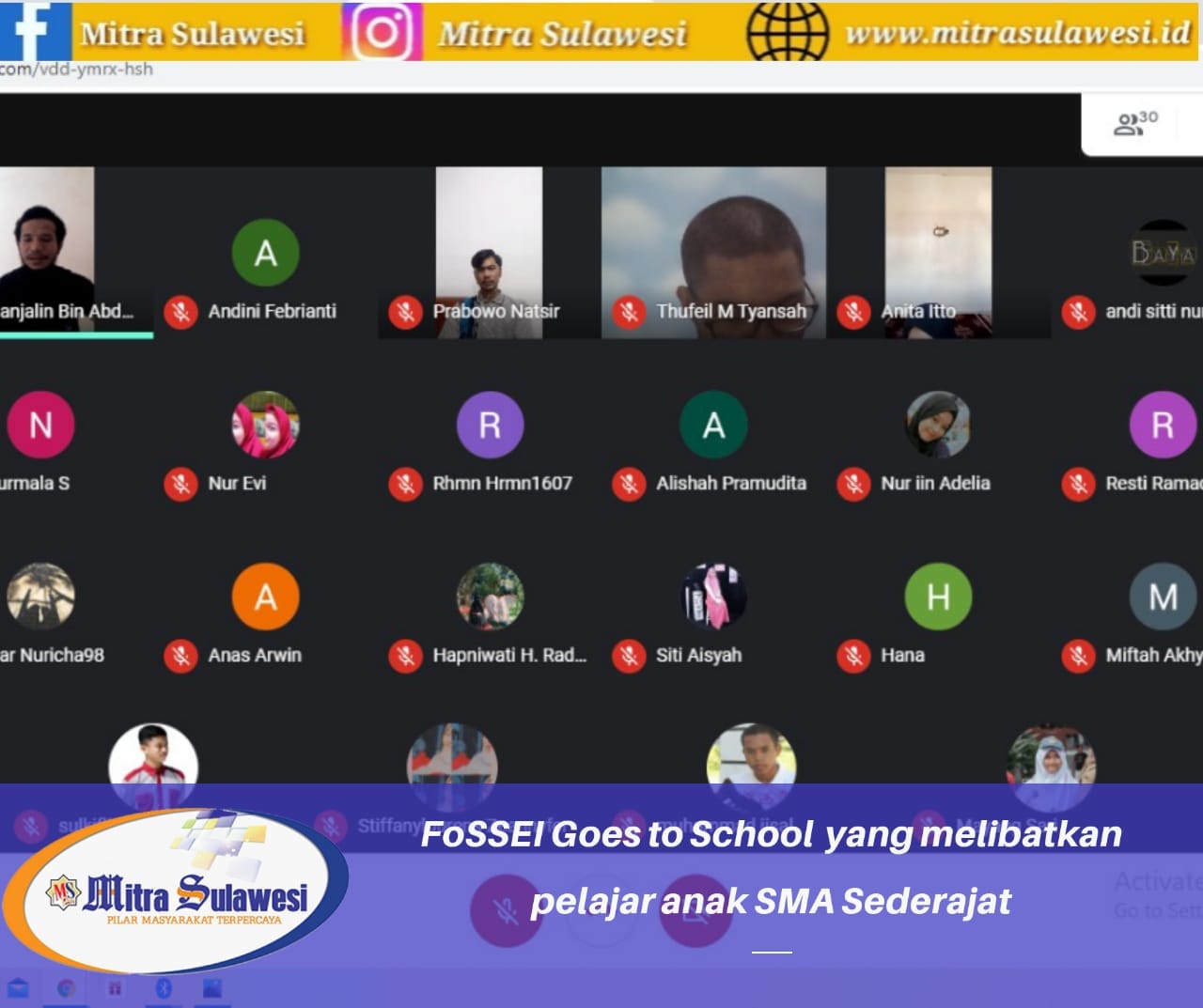 FoSSSEI Goes To School merupakan program kerja bidang humas FoSSEI Regional SulselBar dan Papua, kegiatan ini diadakan secara virtual Google Meeting, dan di isi dua pemateri, pemateri yang pertama dari Presidium Kelembagaan FoSSEI Nasional Thufeil Muhammad Tyansah dan pemateri kedua Koordinator FoSSEI Regional SulselBar dan Papua saudara Manjalin.