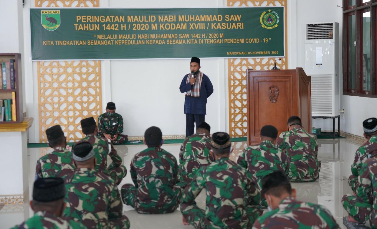 Dalam peringatan hari kelahiran Rosullullah SAW 1442 H/ 2020 M yang bertema “Melalui Maulid Nabi Muhammad Shalallahu‘Alaihi Wasallam 1442 H/ 2020 M kita tingkatkan semangat kepedulian kepada sesama kita ditengah pandemi Covid-19” ini, diisi dengan siraman rohani oleh H. Ali Mustofa S.Pd.I dan diikuti para Perwira Staf Ahli Pangdam XVIII/Kasuari, para Asisten dan Kabalakdam XVIII/Kasuari, serta umat muslim warga Kodam XVIII/Kasuari.