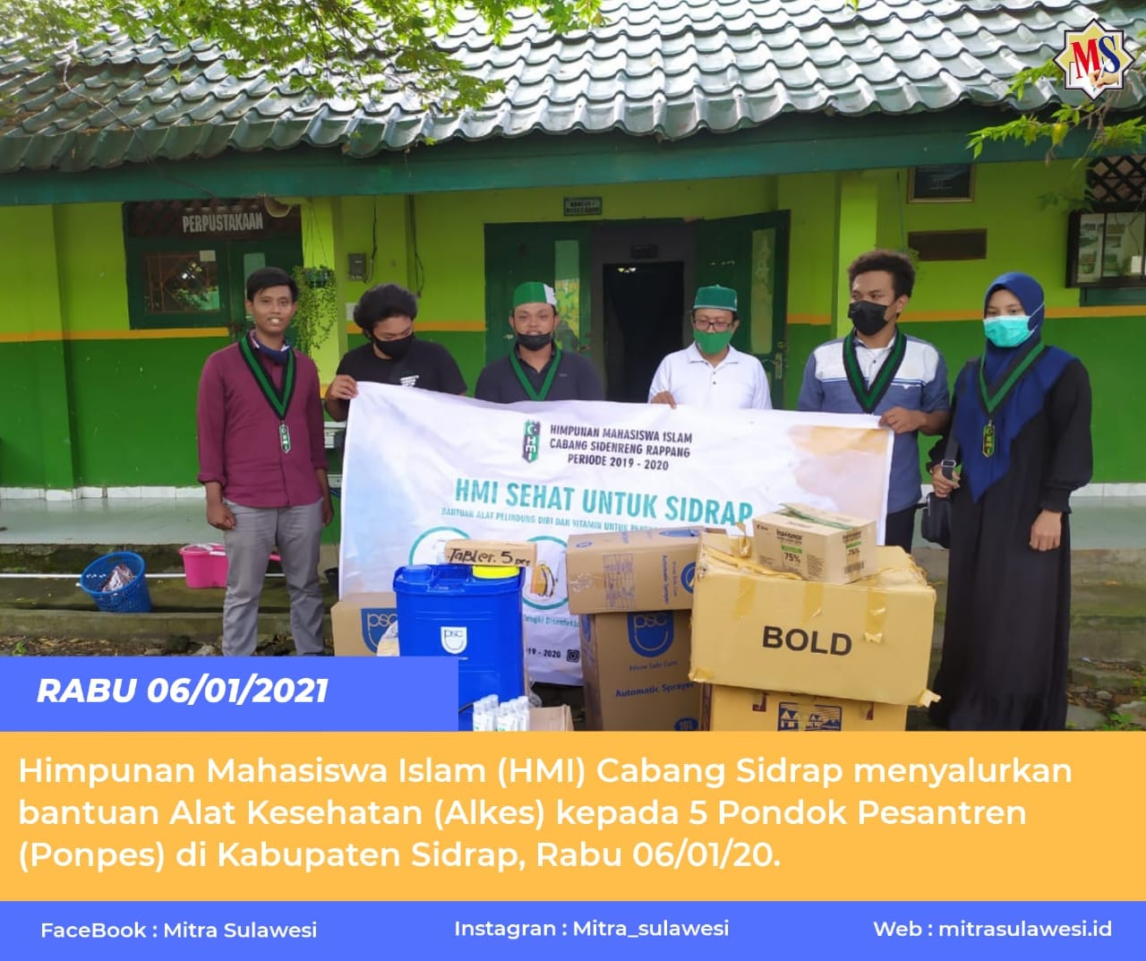 SIDRAP, MitraSulawesi.id– Himpunan Mahasiswa Islam (HMI) Cabang Sidrap menyalurkan bantuan Alat Kesehatan (Alkes) kepada 5 Pondok Pesantren (Ponpes) di Kabupaten Sidrap, Rabu 06/01/20.