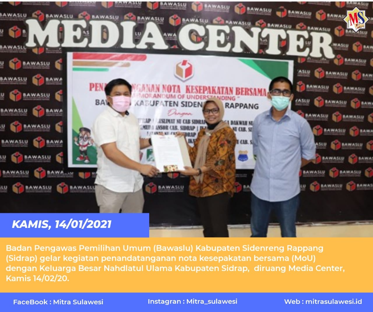 Sidrap, MitraSulawesi.id– Badan Pengawas Pemilihan Umum (Bawaslu) Kabupaten Sidenreng Rappang (Sidrap) gelar kegiatan penandatanganan nota kesepakatan bersama (MoU) dengan Keluarga Besar Nahdlatul Ulama Kabupaten Sidrap, diruang Media Center, Kamis 14/02/20.