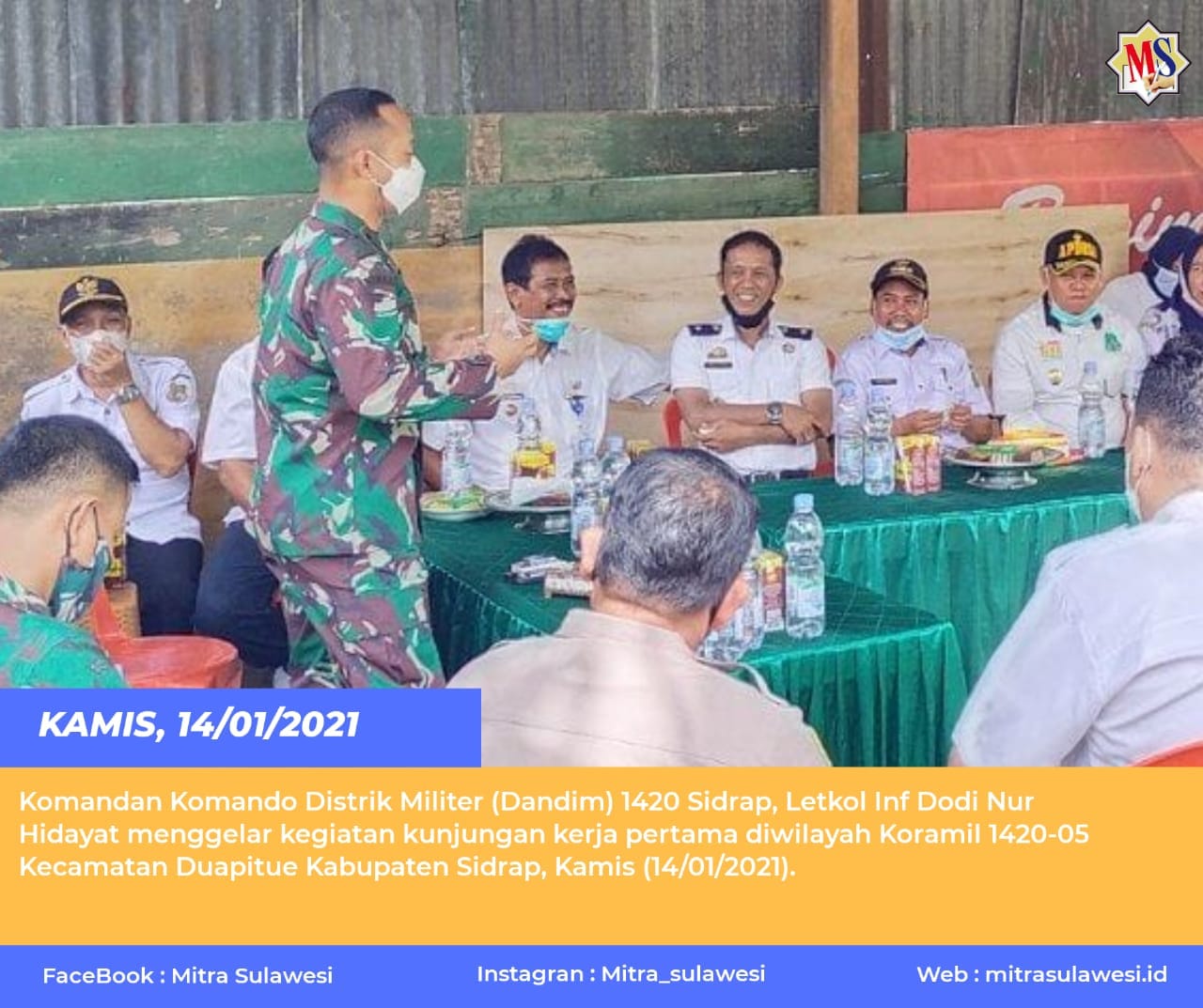Sidrap, MitraSulawesi.id– Komandan Komando Distrik Militer (Dandim) 1420 Sidrap, Letkol Inf Dodi Nur Hidayat menggelar kegiatan kunjungan kerja pertama diwilayah Koramil 1420-05 Kecamatan Duapitue Kabupaten Sidrap, Kamis (14/01/2021).
