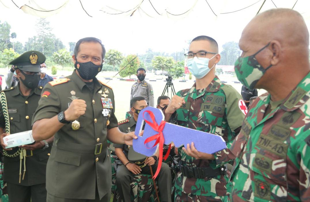 Usai memberikan arahan, Pangdam menyerahkan bantuan untuk Rindam XVIII/Kasuari berupa 1 unit kendaraan ambulans, 1 unit motor viar, ratusan masker kesehatan, dan pisau kapak untuk para peserta didik di Rindam berlatih Lempika (lempar pisau dan kapak).