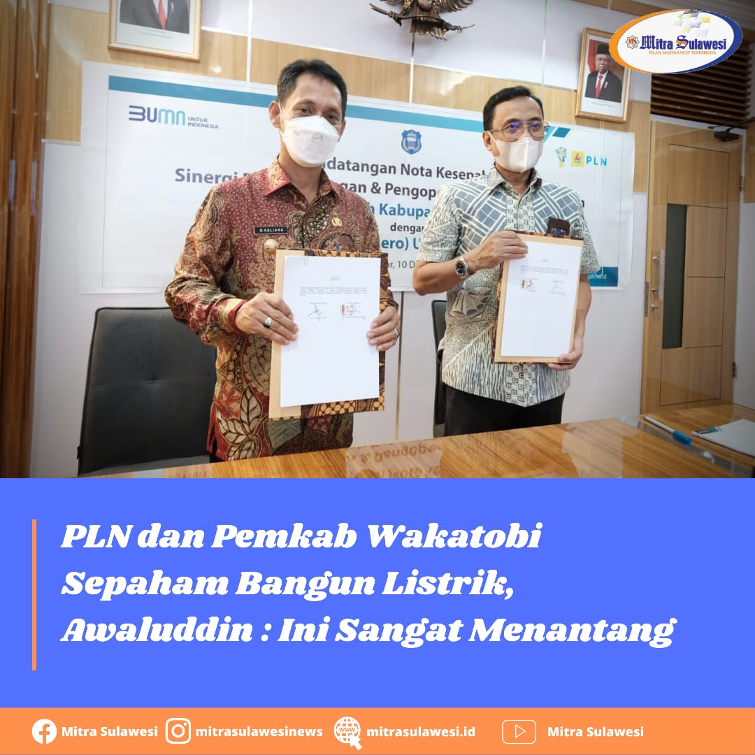 Makassar, MitraSulawesi.id– Guna mendukung pengembangan dan pengoperasian infrastruktur ketenagalistrikan di Wilayah Kabupaten Wakatobi, PLN menandatangani Nota Kesepahaman dengan Pemerintah Kabupaten Wakatobi di Kantor PLN Unit Induk Wilayah (UIW) Sulselbar, 10/12/21.