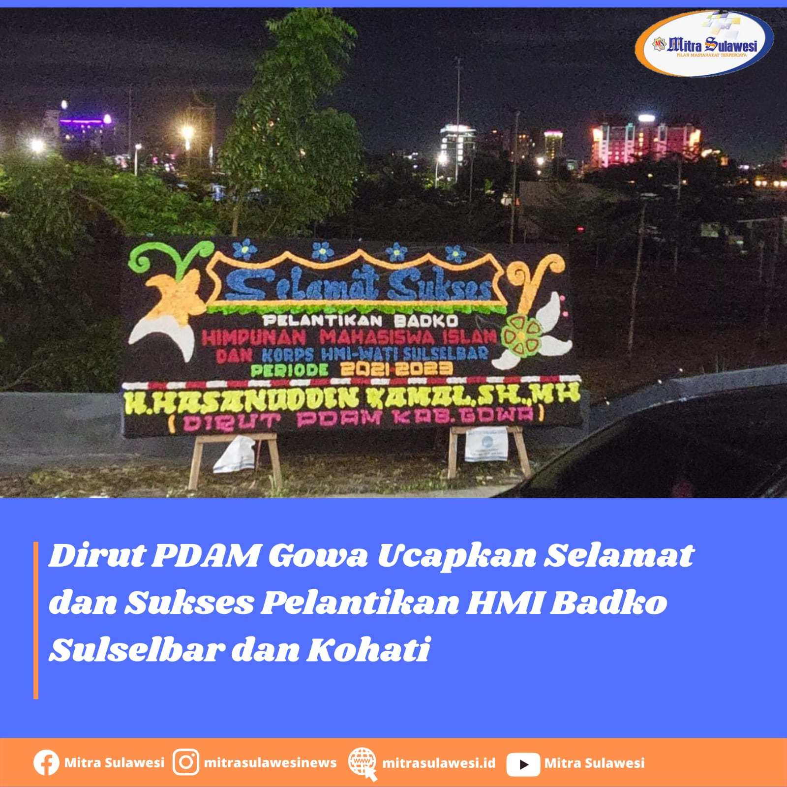 Melalui karangan bunga, Daeng bunga sapaan akrab Direktur PDAM mengucap selamat atas pelantikan Ketua HMI Badko Sulselbar dan Koprs Himpunan Mahasiswa Islam Wati (Kohati) priode 2021-2023. (Ar/tim)