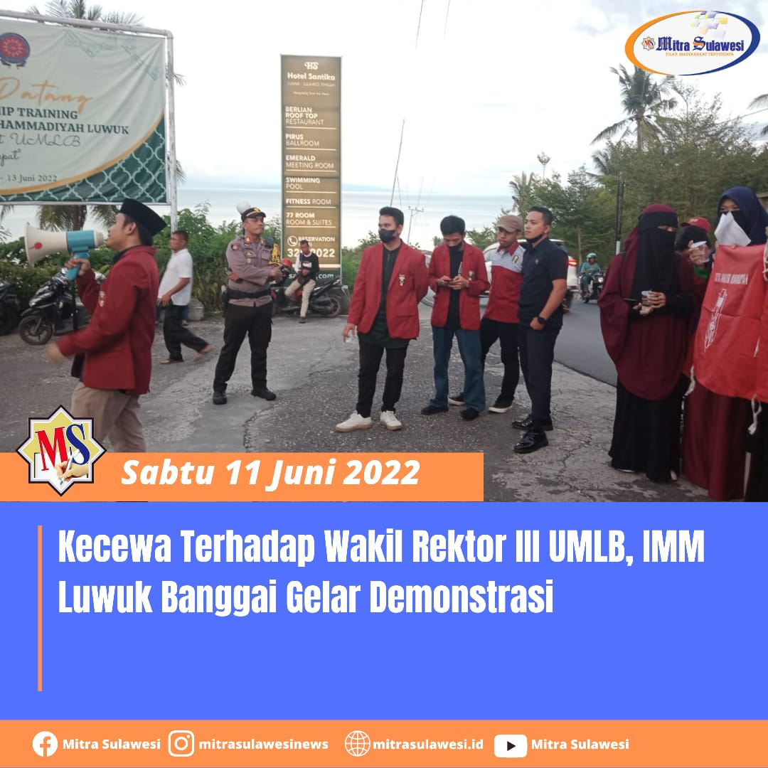 Luwuk, MitraSulawesi.id– Ikatan Mahasiswa Muhammadiyah (IMM) Kabupaten Banggai melakukan aksi demonstrasi sebagai bentuk kekecewaan terhadap Agung K. Djibran, Wakil Rektor III Universitas Muhammadiyah Luwuk Banggai (UMLB) di dua titik berbeda selama dua hari, 10-11 Juni 2022 di depan Hotel Santika dan Kampus UMLB.
