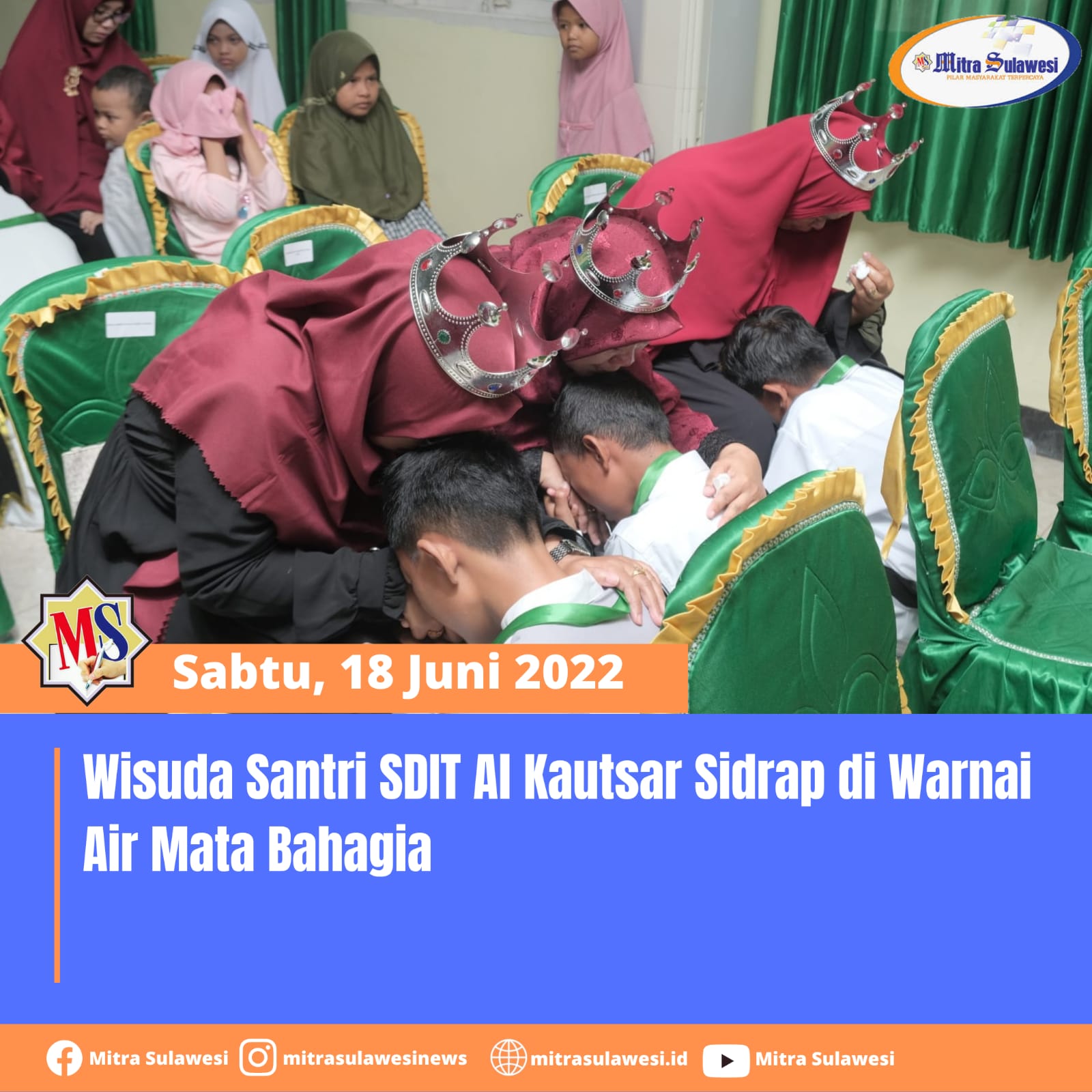 Isak tangis tak terbendung ketika siswa – siswi SDIT Al Kautsar melakukan pemasangan Mahkota ke orang tua masing – masing, sebagai simbol komitmen mereka dalam menghafalkan Al-Qur’an sesuai target di sekolah tersebut telah terpenuhi dan berharap kelak akan memasangkan Mahkota Cahaya di Surga-Nya. Sabtu, 18 Juni 2022.