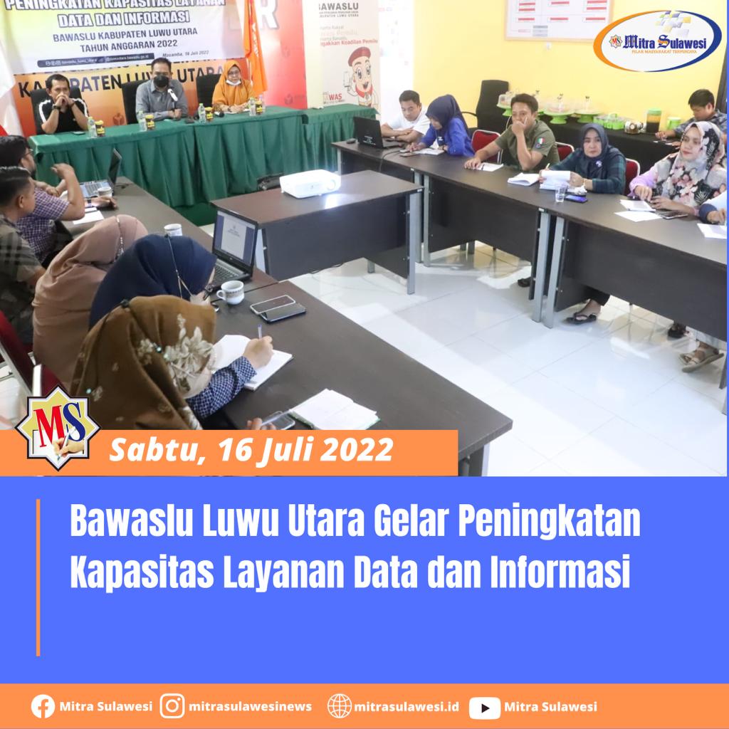 Luwu Utara, MitraSulawesi.id – Bawaslu Luwu Utara menggelar kegiatan peningkatan kapasitas layanan data dan informasi, Sabtu, (16/7/2022).