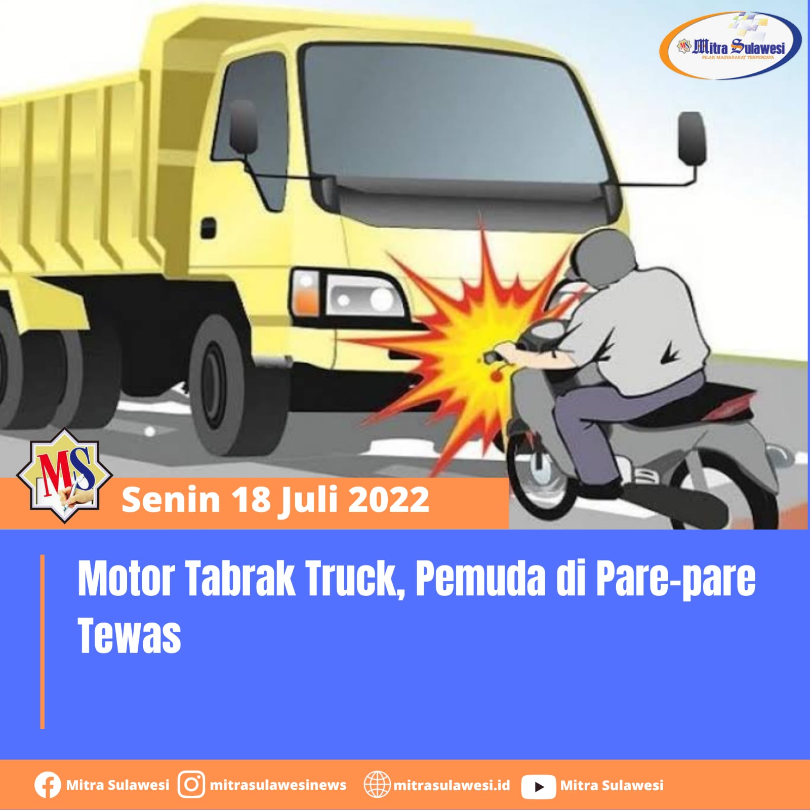 Ya, seorang pengendara motor bernama Herianto (25) tewas kecelakaan di Kota Parepare, Sulawesi Selatan (Sulsel). Korban meninggal setelah menabrak truk yang sementara parkir di jalan.