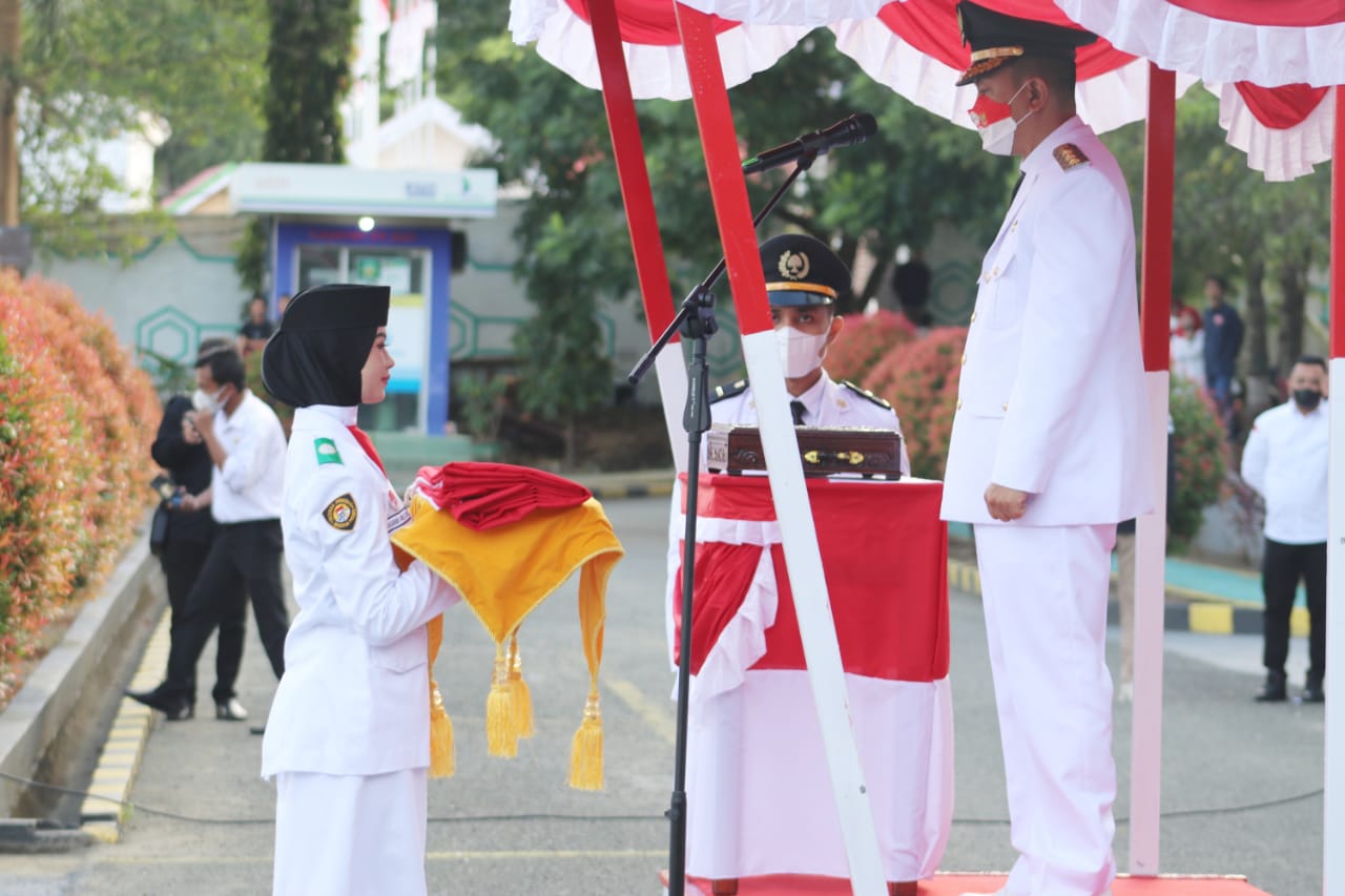 Rangakaian HUT juga mengikuti protokol kesehatan. Proses1 pengibaran bendera pun berlangsung lancar tanda kendala oleh paskibra.