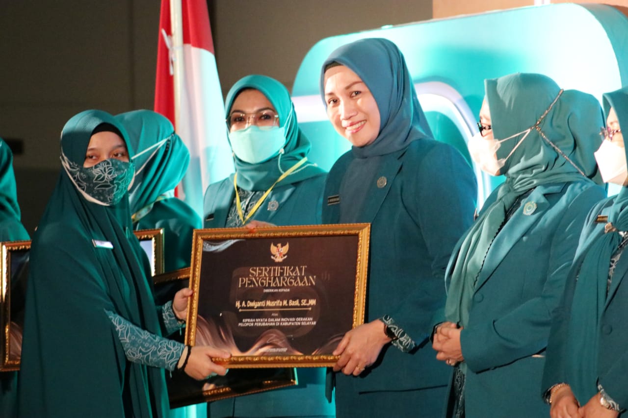 MAKASSAR, MITRASULAWESI.ID – Ketua TP PKK Kabupaten Kepulauan Selayar Hj. Andi Dwiyanti Musrifah Basli, S.E., M.M dianugerahi penghargaan atas kiprah nyatanya dalam inovasi gerakan pelopor perubahan di Kabupaten Kepulauan Selayar.