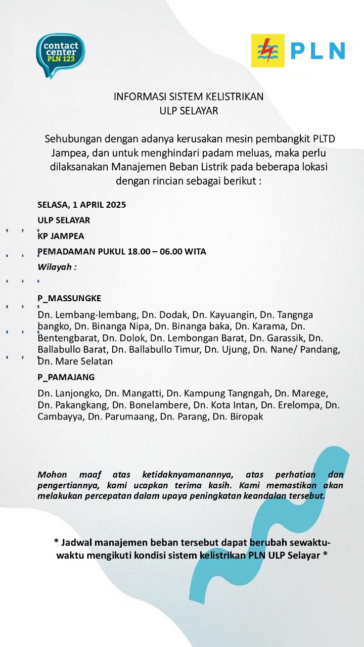 Selayar, mitrasulawesi.id – PT PLN Unit Layanan Pelanggan (ULP) Kabupaten Kepulauan Selayar merespon adanya pemberitaan pemadaman lampu dua hari di wilayah Jampea, Pasimasunggu pada saat malam lebaran Idul Fitri 2025.