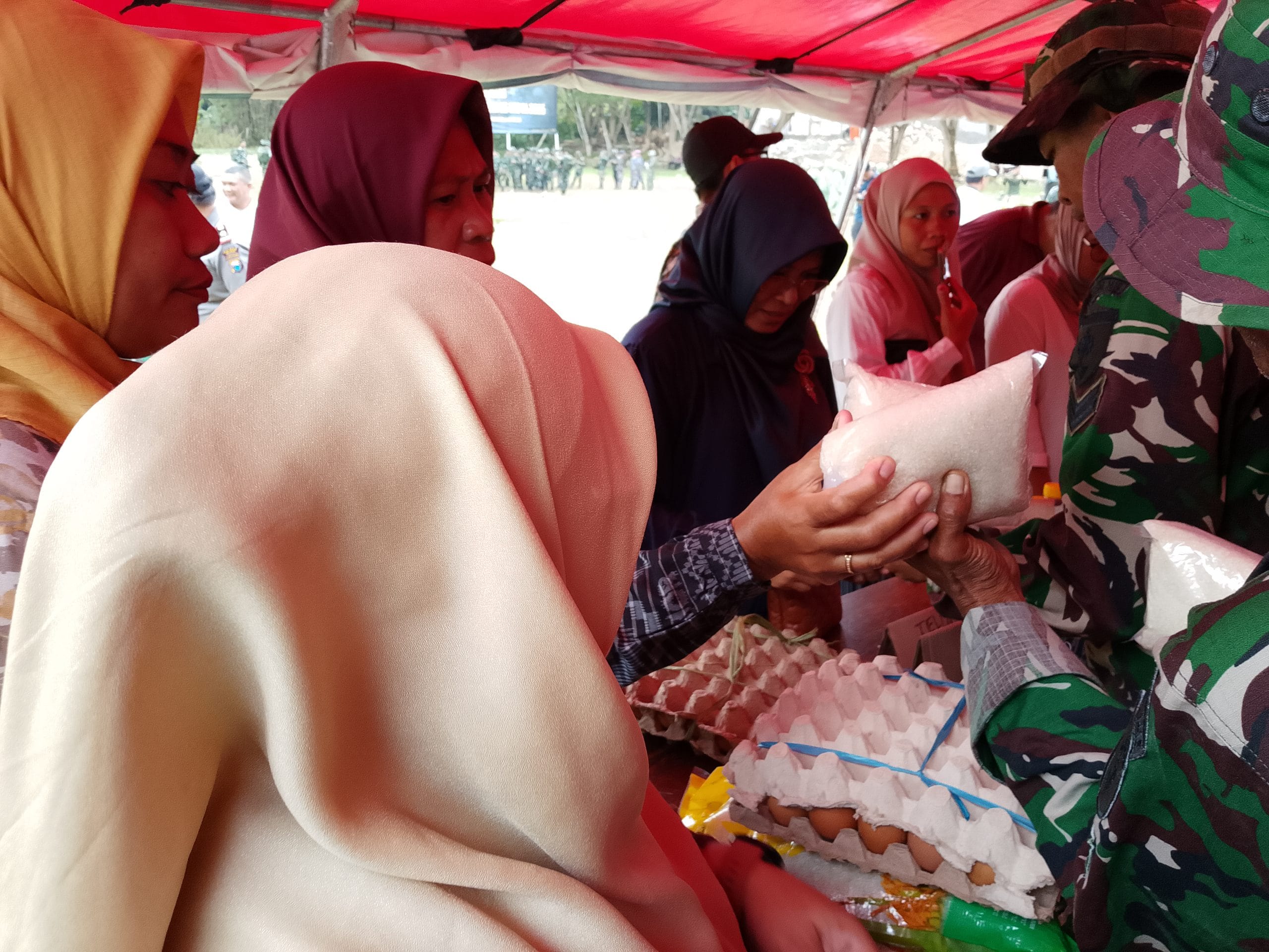 Warga memadati Pasar murah TMMD dikarenakan penjualan sembako dengan selisih harga yang cukup signifikan membantu mengurangi beban pengeluaran rumah tangga warga.